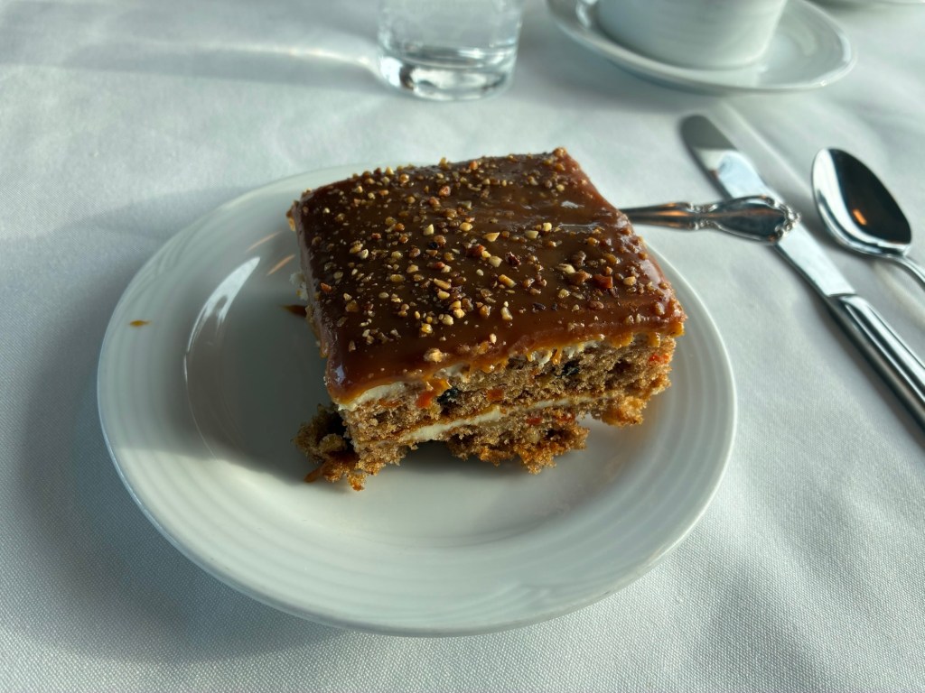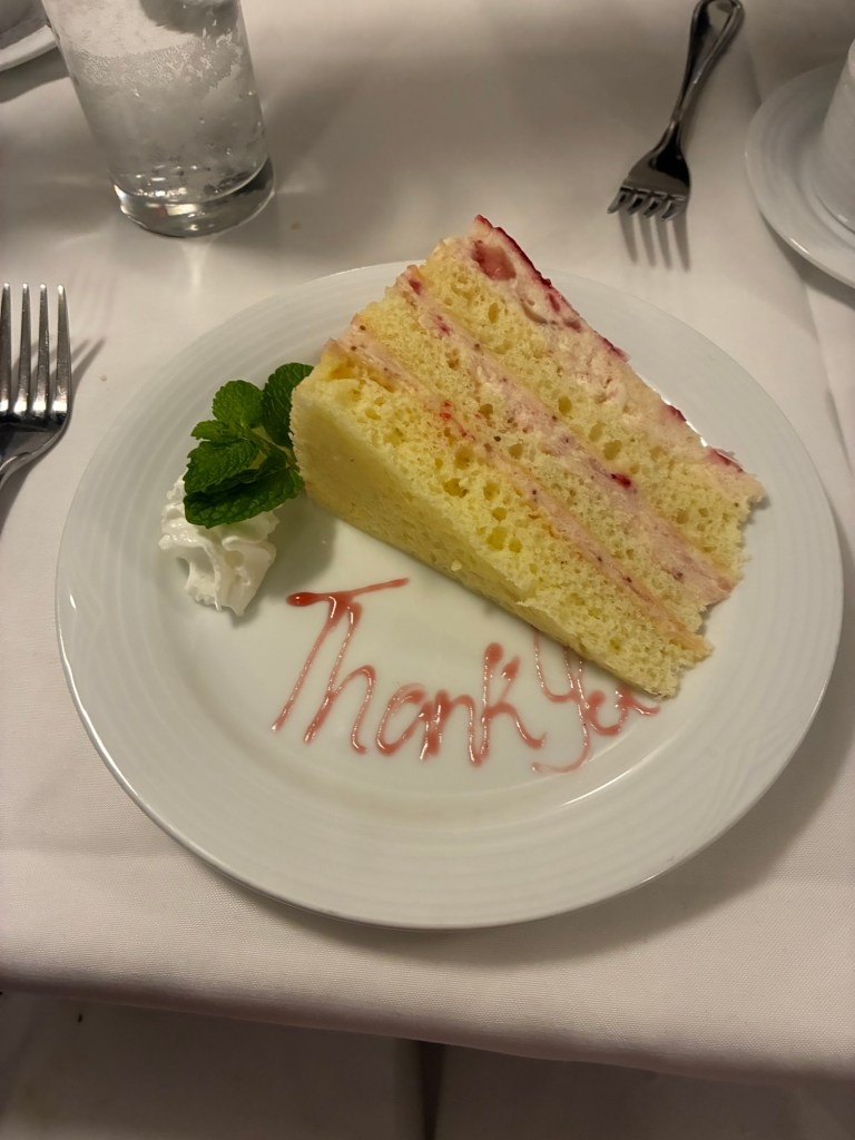 My phone was still charging during dinner, so I didn’t get a picture of dinner, but it was just rack of lamb. Delicious and spectacular, but I’m pretty sure everyone can summon the mental image of rack of lamb. I ended up seated with an Asian couple who didn’t really speak English, and a man I could have sworn was Japanese but said he was from Hawaii. He was not super chatty, but we made some small talk.