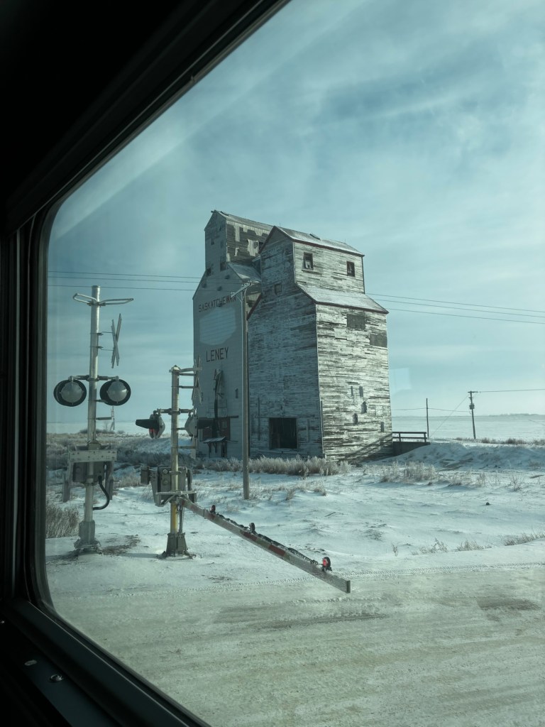 We crossed the Prairies in stops and starts. We had to keep stopping for grain cars, but when we could go the train flew at 130 kilometers an hour, or 85mph.