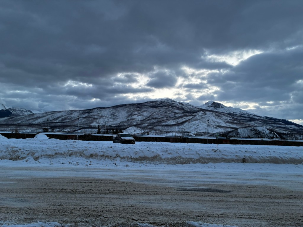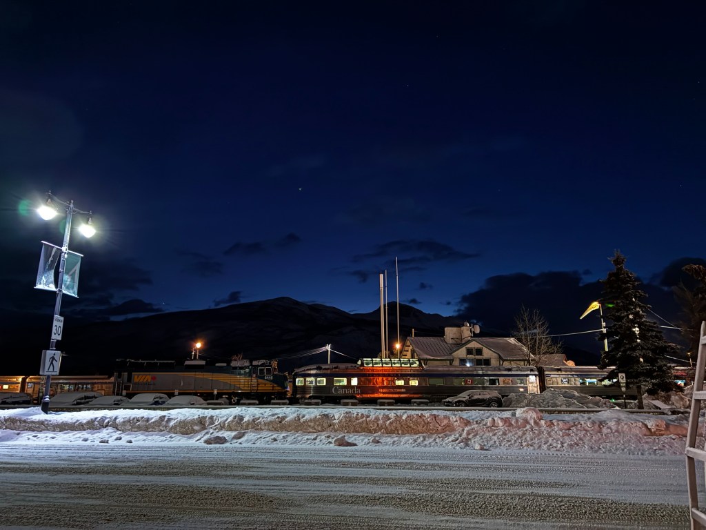 I climbed out of bed. We’d dropped off everyone at Edmonton while I was sleeping, and the bunks opposite me stayed in the couch formation, so I sat down with my headphones and watched the ghost of trees go by. We were now on Mountain time, climbing steadily into the foothills of the Rockies. I sat up for close to an hour, before finally dosing myself with melatonin and Tylenol to get back to sleep.