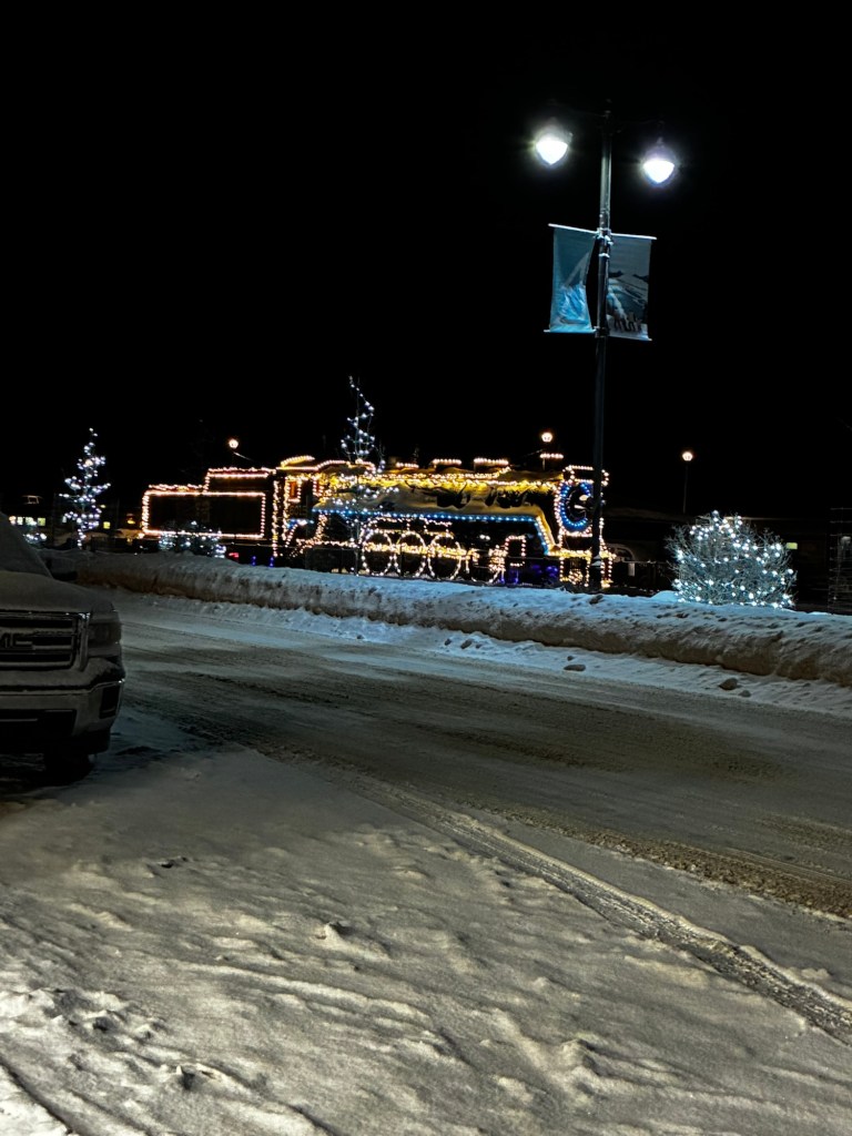 I stopped in the lounge car, confused. They had some breakfast items laid out – muffins and fruit – and I thought this was it. I made myself a tea and a muffin and sat down for a bit. We stopped briefly at a small town with a pretty downtown core, complete with a Christmas tree.