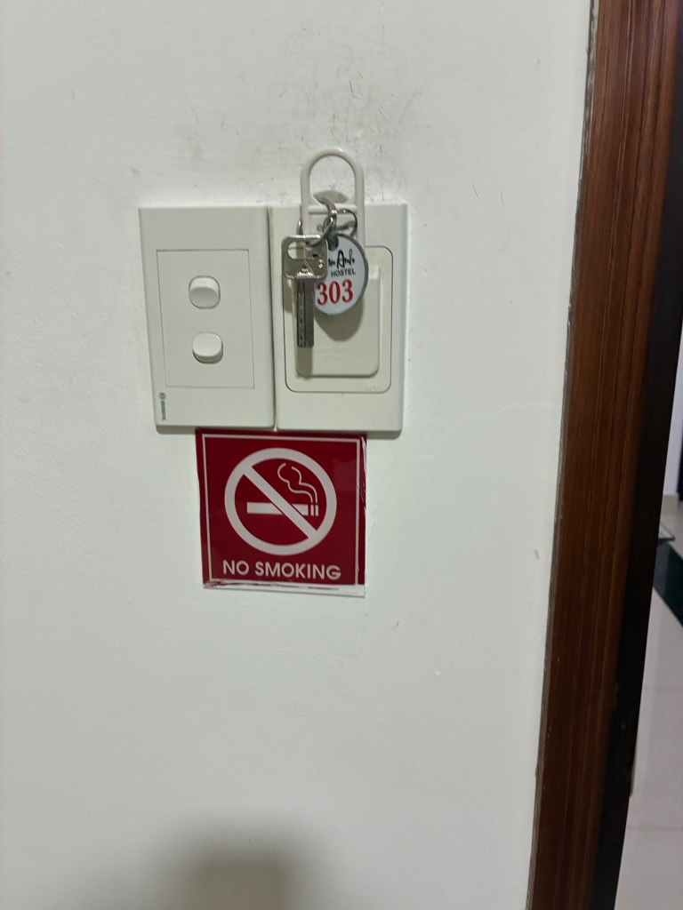 The room was nice, if Spartan. You have to place the key in a slot on the wall, to make sure you don’t leave the lights on and the AC running while you’re out all day.