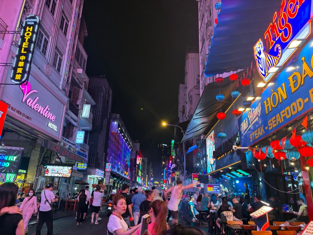 I hate complaining about kindness, but misplaced kindness is… well… the road to hell is paved with good intention. Lan dragged me around the corner to Bui Vien street, which is the same as Khao San road; loud bars with pretty girls, scantily clad; giant TV screaming at you; speakers belting out Western music. You could tell Lan never comes down here and was enjoying walking around, talking pictures and videos to send to people, so I didn’t want to complain.