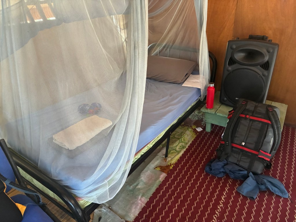 The hut was also a little sketchy. The walls were not solid, presumably to allow air flow, but it also meant there was no sound resistance at all. No AC either, but a single fan, a single light bulb, and a single socket for my use. There was a chair, a bed with a mosquito net, and a table with a speaker on it (I later moved the speaker so I could use the table).