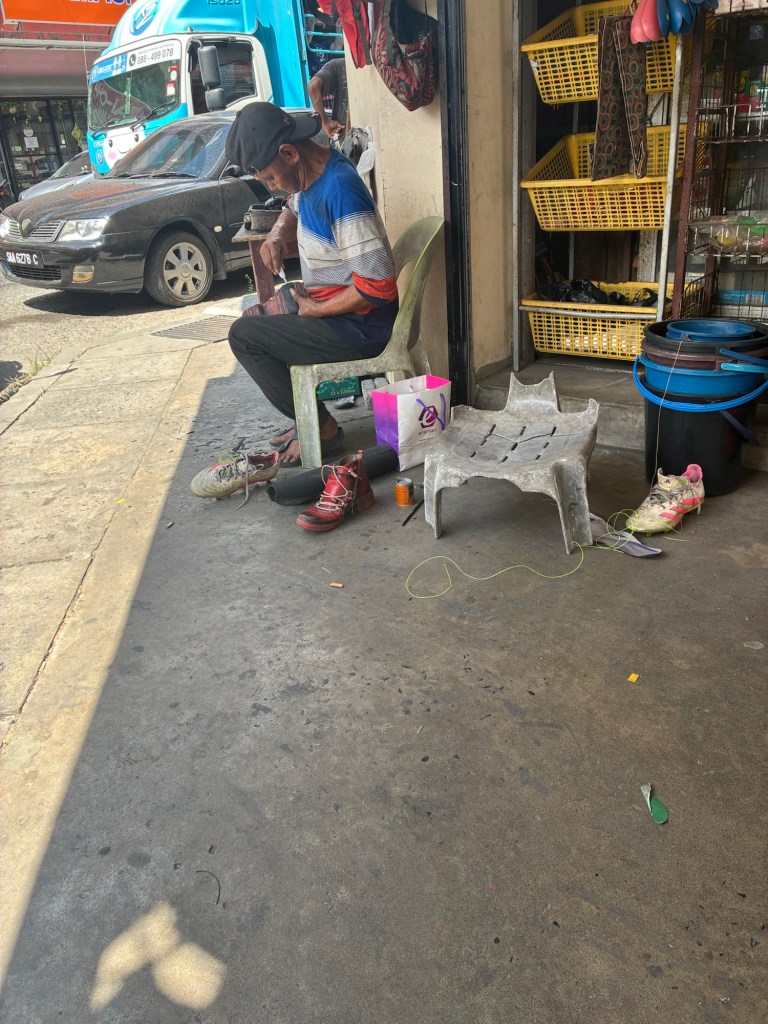 Next stop; Watsons! Ismail mentioned there was a cobbler near Watsons, and my boots have split entirely from side to side, to the point of being unusable. I found the cobbler, and he spent half an hour gluing a strip of rubber along the crack. David wandered off. I went into Watsons to grab some sunscreen and feminine hygiene products.